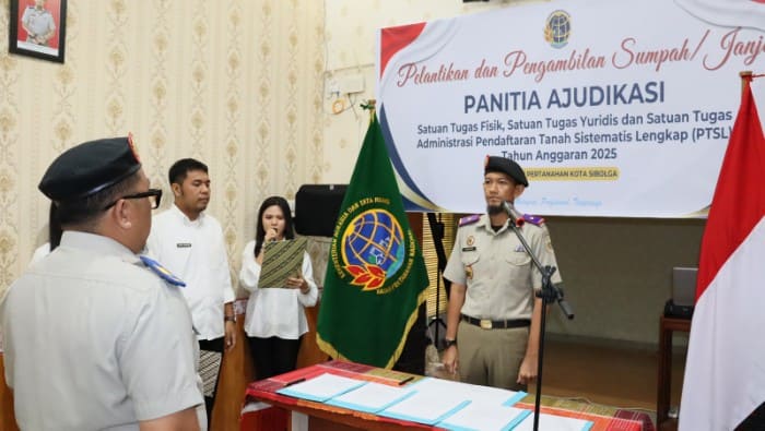 Sibolga, Tapanuliraya.com – Kantor Pertanahan (Kantah) Kota Sibolga kembali melaksanakan pelantikan dan pengambilan sumpah/janji Panitia Ajudikasi Satuan Tugas (Satgas) Fisik, Satgas Yuridis, dan Satgas Administrasi dalam rangka pelaksanaan Program Pendaftaran Tanah Sistematis Lengkap (PTSL) Tahun Anggaran 2025.